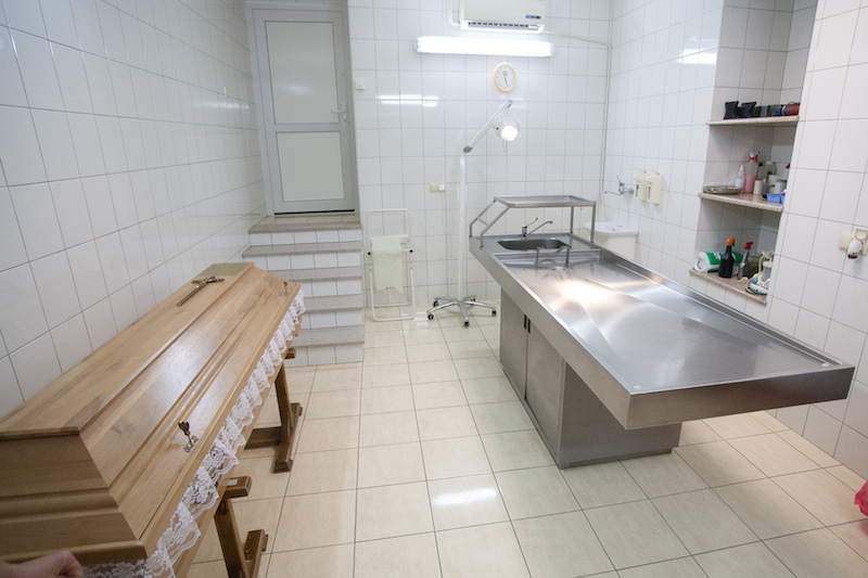Po zakończeniu przygotowywania ciała osoby zmarłej do ceremonii ostatniego spotkania z rodziną w sali pożegnań, w pomieszczenia prosektorium uruchamiamy specjalistyczne lampy bakteriobójcze (tj. lampy wykorzystywane w salach operacyjnych szpitali).